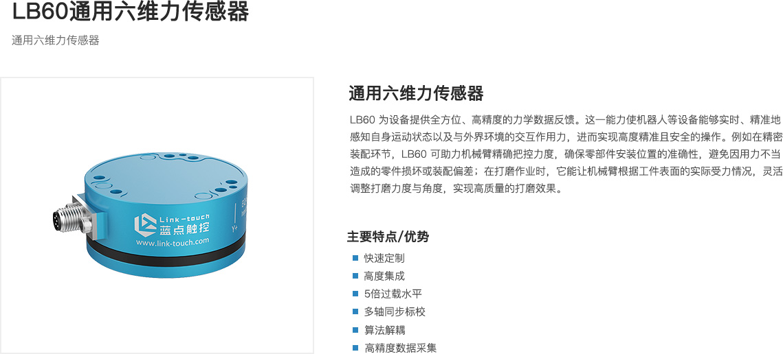 LB60 通用六维力传感器 为设备提供全方位、高精度的力学数据反馈。这一能力使机器人等设备能够实时、精准地感知自身运动状态以及与外界环境的交互作用力,进而实现高度精准且安全的操作。例如在精密装配环节,LB60 可助力机械臂精确把控力度,确保零部件安装位置的准确性,避免因用力不当造成的零件损坏或装配偏差;在打磨作业时,它能让机械臂根据工件表面的实际受力情况,灵活调整打磨力度与角度,实现高质量的打磨效果。