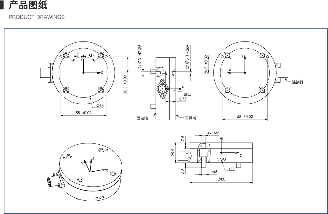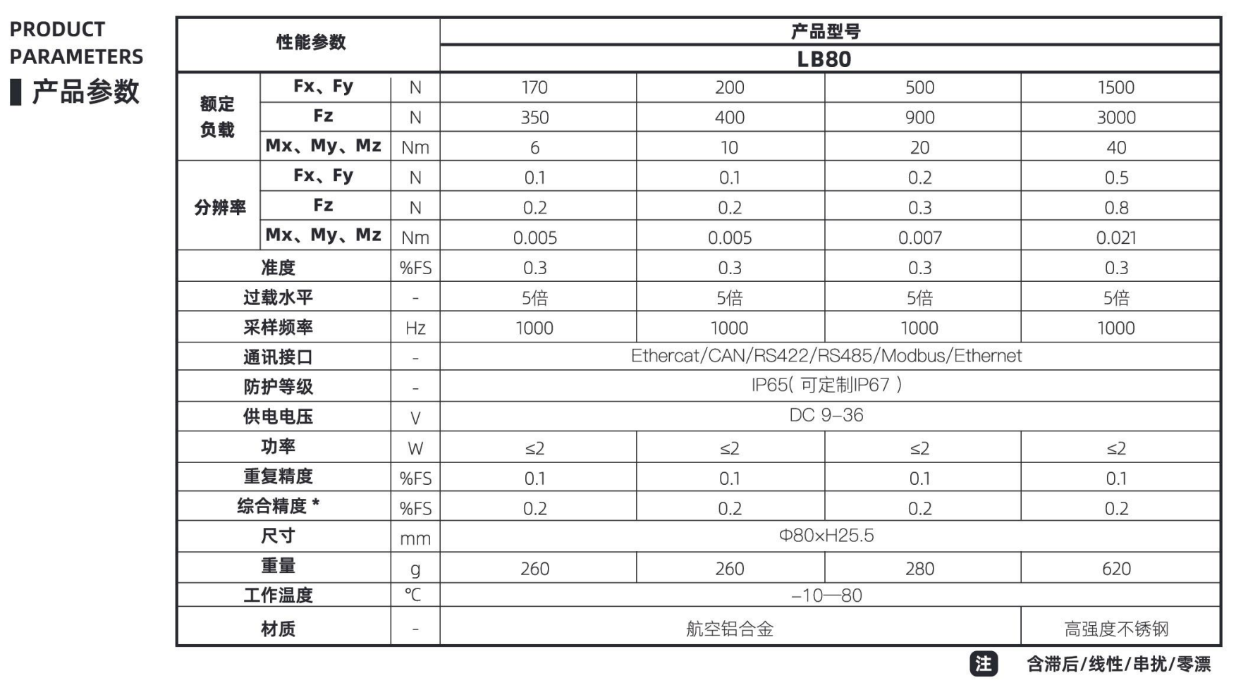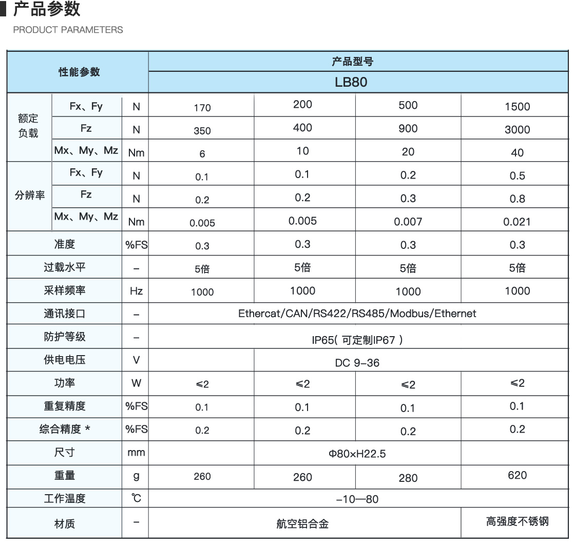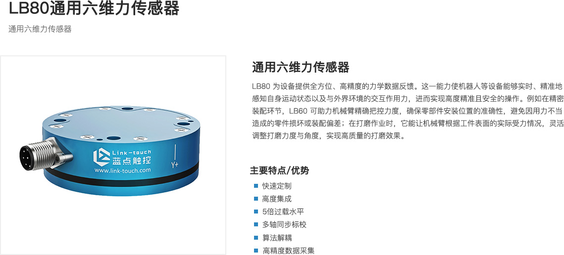 LB80通用六维力传感器是一款高性能六维力传感器,能够同步精准测量三个方向的力与力矩,为工业机器人及自动化设备提供实时的力觉感知。产品采用先进的解耦算法与温度补偿技术,实现高达0.2%FS的综合精度、0.1%FS的重复精度及0.3%FS的准度,同时极低的串扰,确保在精密装配、自适应打磨、力控测试等复杂应用中数据的精准、可靠。LB80传感器以卓越的过载保护能力和实时反馈能力,赋予机器人真正的“触觉”,是提升工业自动化生产线柔性制造与灵巧操作能力的核心关键部件。